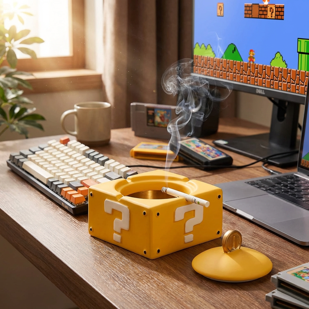 Transform your smoking area into a Mushroom Kingdom adventure. This pixel-perfect Question Mark Block Ashtray features a clever domed lid topped with a shiny "Gold Coin" handle. πͺ